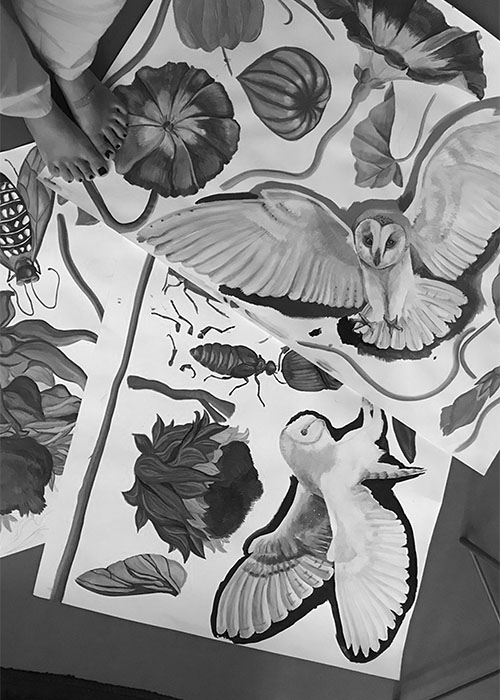 Ik heb mij laten inspireren voor mijn collecties door de natuur. Ik probeer altijd gericht te zijn op mijn omgeving opzoek naar nieuwe inspiratie, vormen en kleuren. Dit neemt ik mee naar haar atelier waar ik met gouacheverf de illustraties schildert voor mijn designs.